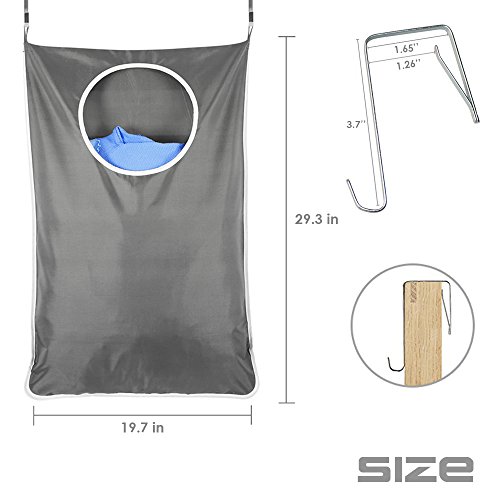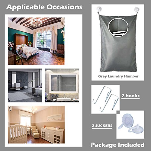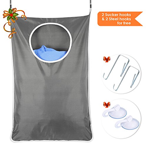 BESEGO Door-Hanging Laundry Hamper Bag with Free 2 PCs Stainless Steel Door Hooks and 2 PCs Suction Cup Hooks, Best Choice for Holding Dirty Clothes and Saving Space (Grey)