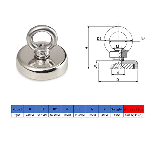 Wukong 249LBS Pulling Force(113 killogram) Super Powerful Round Neodymium Magnet with Countersunk Hole and Eyebolt Diameter 2.36INCH(60mm) for Retrieving in River and Magnetic Fishing