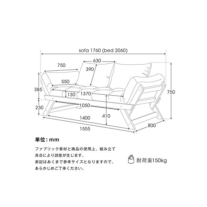【사이즈(통상type)】폭1760~2060x(길이)깊이800x높이750(좌면고410)mm 【중량(통상type)】30.45kg 【내하중(공통)】베드 소파 시:150kg,팔꿈치 부분:25kg