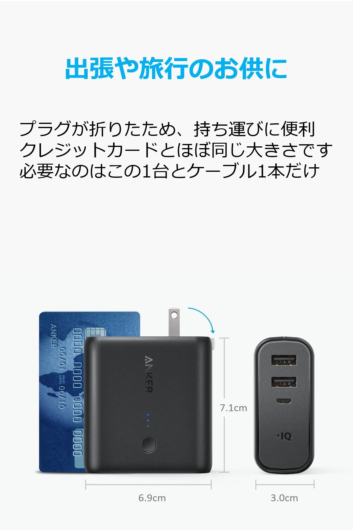 There is a dent as if it is also a status lamp under the two USB - A ports. Looking at this is the input terminal of MicroUSB (in 5 V 2.1 A) Most of the handheld AC charger integrated mobile battery When charging the built-in battery, there are many products requiring outlets, but this product has a structure that is extremely grateful from ok from the outlet, ok from MicroUSB too. (It says that please do not do outlet and MicroUSB input at the same time in the instruction.) In addition, although I was using Panasonic's QE-AL 101 until now, it is cable compatible if it is an iOS terminal There are many things that do not become fast charge, and it was definitely supposed to be power supply for extending life rather than charging (android was over 1A) There is anker funky there, with iPad Pro 12.9 5 V 2.4 A It charges us with considerable amount. Although it does not appear in the web, it seems that it is written only in the instruction manual attached to the product · MicroUSB input: 5 V 2.1 A · Output of USB-A when inserting in the outlet: Total 2.1 A · When used as a mobile battery USB-A output: Total 3 A · When using as an AC adapter, the built-in battery of this product is not charged until the smartphone etc is fully charged. Included pouch extends well 10 cm x 10 cm MicroUSB cable of black nylon (USB-A → MIcroUSB ) As a reason of 50 cm weak star - 1 - anker should talk about specifications such as output ampere more (although it is only necessary to put the enclosed instruction manual on the product page as pdf) - somewhat But it is thick and heavy, just a few but because the plug plug is popping out so it seems to hurt other items in the bag (So included with the pouch?)
