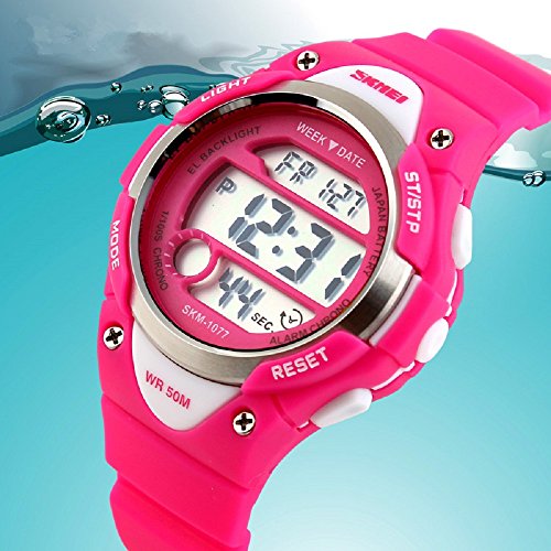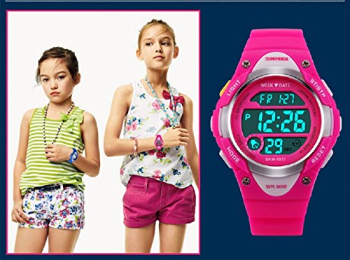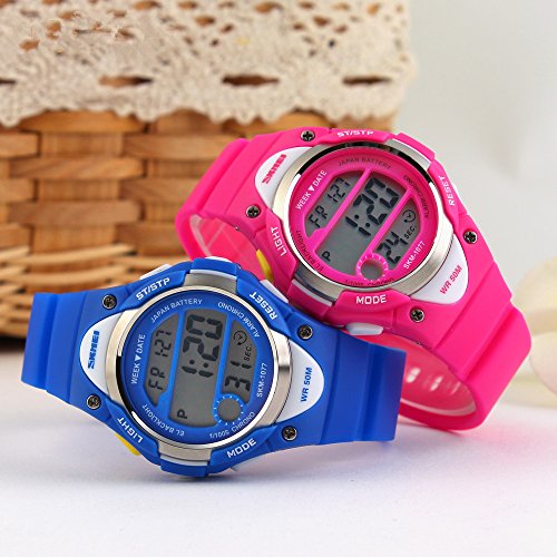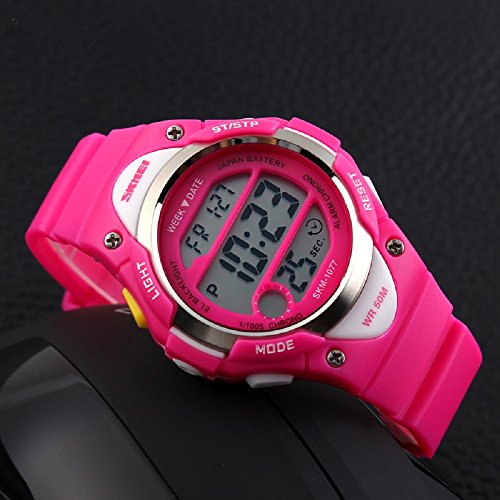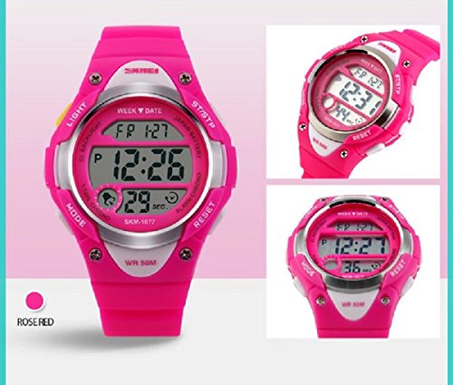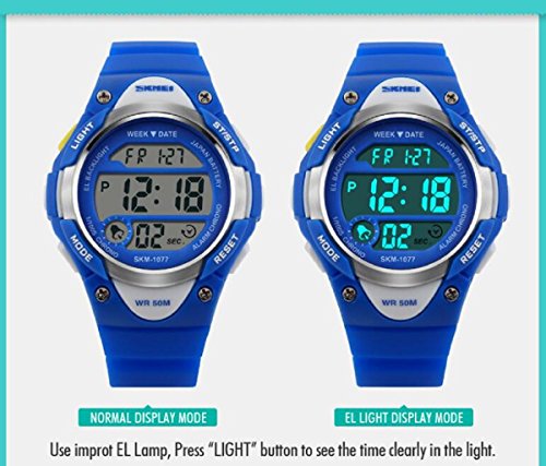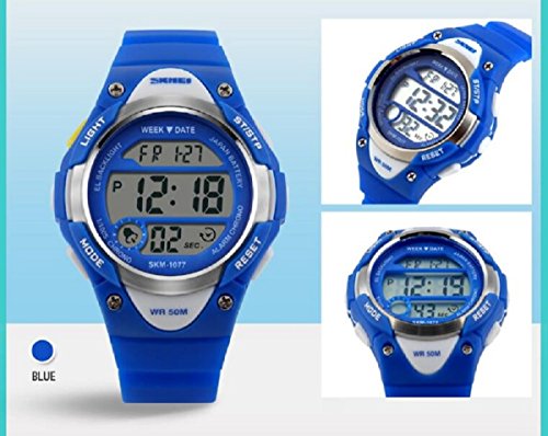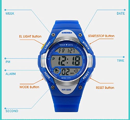 -. Feature : ◆MULTIFUNCTIONS:Alarm Clock,Stop Watch,button-activated LED back light,50M Waterproof,date/week/AM /PM/hour/minute/second display;12/24 hour format. / ◆WATER-RESISTANT to 50M:Suitable for swimming and surfing.NOTE: Please DO NOT press any buttons in the water or wear this watch for longtime underwater activities. / ◆HIGH QUALITY of STRAP:Made of Germany Imported PU Resin Strap,the soft strap which suitable for kids outdoors sports activity.As a gift to the children's best choice. / ◆PRECISE TIME KEEPING: Japanese Movement, provide precise and accurate time keeping.Japanese battery which can provide the watch strong power. / ◆HIGHLY ABRASION RESISTANT GLASS: The glass is made from the highly clear resin material imported abroad and sealed with the case by high frequency machine. So that the glass is extremely hard and pressure-tolerant.