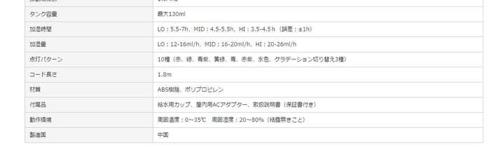 ●加湿量・・・LO:12ー16ml/h、MID:16ー20ml/h、HI:20ー26ml.h