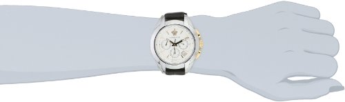 Feature : Versace presents luxurious masculinity in this automatic timepiece's rich leather strap, rose gold accents, and creamy textured dial complete with the Versace logo. / Swiss Automatic movement with analog display / Protective anti-reflective sapphire dial window / Features date display, exhibition window on case back, rose gold crown and pushers, tachymeter on inner bezel, chronograph sub-dials / Water resistant to 99 feet (30 M): withstands rain and splashes of water, but not showering or submersion