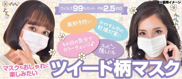 細かなツイードが特徴のオシャレなデザインマスク。細かく入る色合いが顔全体に明るい印象を与えてくれます♪