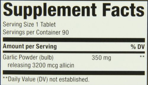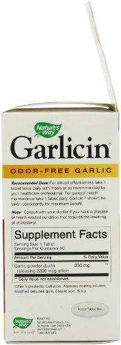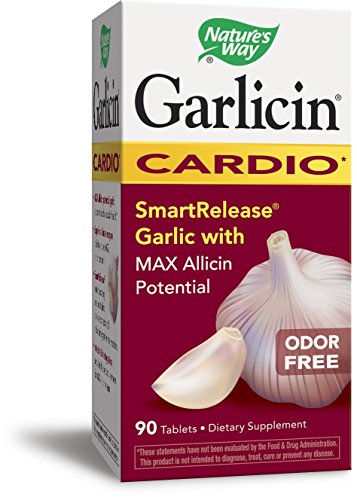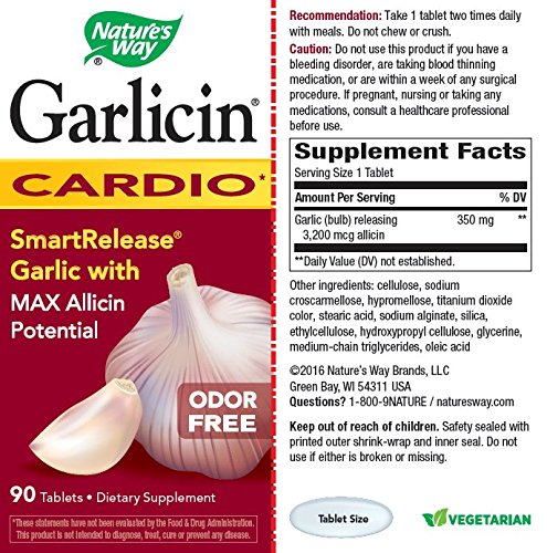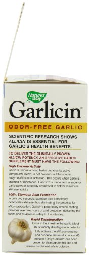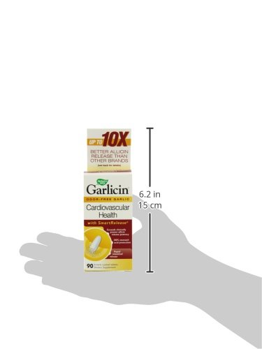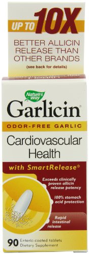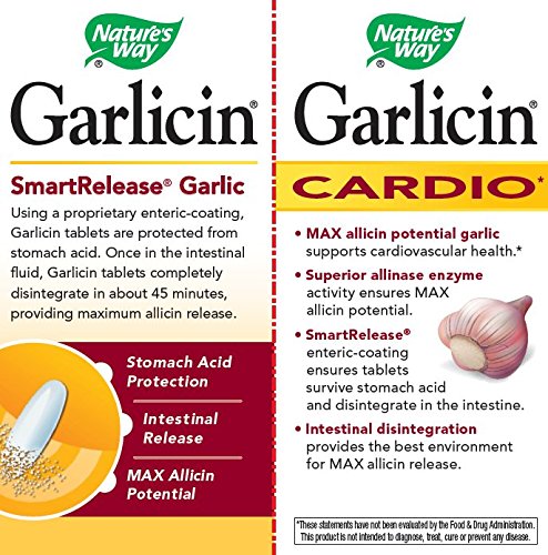 ReleaseDate : 2010-05-13 Studio : Nature's Way Publisher : Nature's Way Binding : Health and Beauty Product Description Product Description:Smart Release Garlic Using a proprietary enteric-coating, Garlicin tablets are protected from stomach acid. Once in the intestinal fluid, Garlicin tablets completely disintegrate in about 45 minutes providing maximum allicin release.Clinical studies have shown cardiovascular benefits of garlic with high allicin potentialGarlicin is made from a superior garlic powder for maximum allinase activitySmart Release tablets protect the allinase enzyme necessary for allicin production.Intestinal Disintegration provides an environment best suited for maximum allicin release.Suggested Use As a dietary supplement take 1 tablet two times daily with meals. Do not chew or crush. If pregnant, nursing, or taking prescription drugs, consult your healthcare practitioner before use - Or as directed by your healthcare professional.Supplement Facts Serving Size: 1 Enteric-Coated Tablet Servings Per Container: 90Amount Per Serving% Daily Value***Garlic powder (bulb) releasing 3,200 mcg allicin350 mg***Percent Daily Values are based on a 2,000 calorie dietOther Ingredients: Cellulose, Modified cellulose gum, Modified cellulose, Stearic acid, Titanium dioxide color, Silica, Sodium alginate, Vegetable glycerin, Fractionated coconut oilWarnings: Keep out of reach of children. As with all dietary supplements, consult your healthcare professional before use. See product label for more information. 0