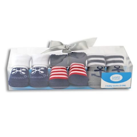 -. Feature : Baby Boy 3 Pack Socks Gift Set~Boxed with Bow / Fits newborn ages 0-9 months / Assorted styles / This adorable sock set makes a great baby shower gift! The set features a navy blue faux shoe design, red and white striped design with navy blue accents, and a nautical design with blue and white stripes.