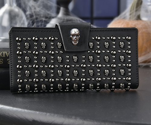 Binding : Apparel Product Description Get your ghoul on with this sleek and spooky Skeleton wallet. Stylish clutch features 11 card slots, one clear ID slot, 2 pockets for bills and a zippered coin pocket. Snap closure keeps contents secure. Made of black vinyl with PVC and alloy accents. Measures 7.5" long x 4" wide x 1.25" deep. 0