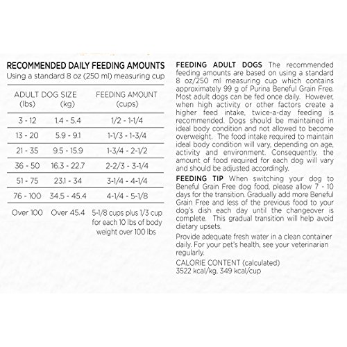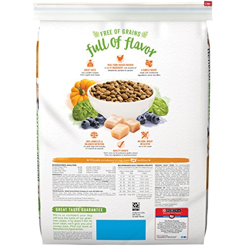Serve your dog Purina Beneful Grain Free With Real Farm-Raised Chicken adult dry dog food, and give him a meal that features real farm-raised chicken as the number one ingredient. With accents of blueberries, pumpkin and spinach, this adult dry dog food provides your dog with a grain-free meal that emphasizes abundant nutrition without sacrificing on taste. Free of grains yet full of flavor, this Purina Beneful recipe is made without corn, wheat or gluten, so you can feel good about serving it every day. He'll eat up the delicious flavor that dogs love while getting 100% complete and balanced nutrition for adult dogs. The crunchy texture gives him something to sink his teeth into, and the wholesome formula made with real ingredients gives you an option to feel good about feeding your best friend. Plus, there are never any fillers. You know you're giving him high-quality protein with essential vitamins and minerals to help support his whole-body health and that's what matters. Purina Beneful Grain-Free with Farm-Raised Chicken Dog Food, 12.5 lb Bag: