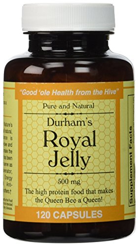 -. Binding : Health and Beauty -. Brand : Durham's Bee Farm, Inc. -. EAN : 0811868754192 -. Feature : Freeze-Dried Royal Jelly contains 100% of the original nutrients / Freeze-Dried Royal Jelly is fresh Royal jelly with the water removed / Freeze-Dried maintains its full strength providing you a wonderful product that is very stable / It is the Royal Jelly that makes a Queen honey-bee a Queen. -. Label : Durham's Bee Farm, Inc. -. Manufacturer : Durham's Bee Farm, Inc. -. Model : RJC500 -. MPN : RJC500 -. NumberOfItems : 1 -. PackageQuantity : 1 -. PartNumber : RJC500 -. ProductGroup : Health and Beauty -. ProductTypeName : HEALTH_PERSONAL_CARE -. Publisher : Durham's Bee Farm, Inc. -. Studio : Durham's Bee Farm, Inc. -. Title : Durham's Royal Jelly 500 mg (120 capsules) -. UPC : 811868754192