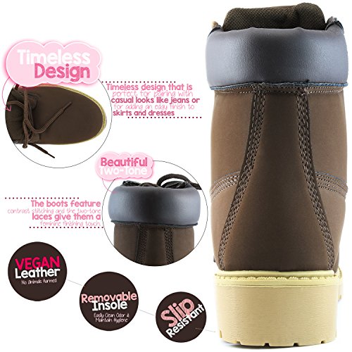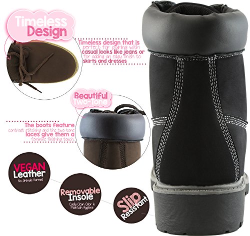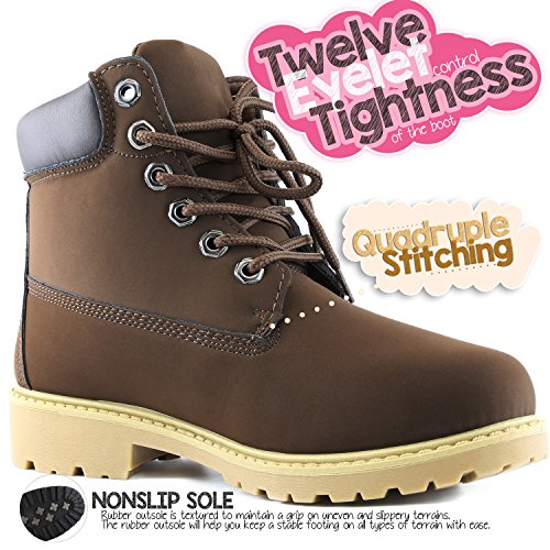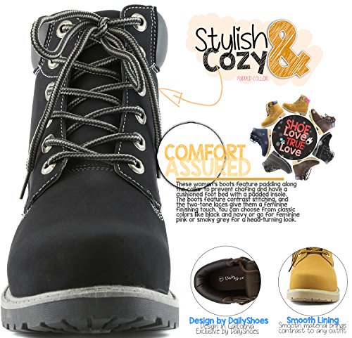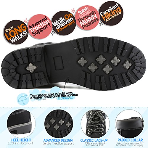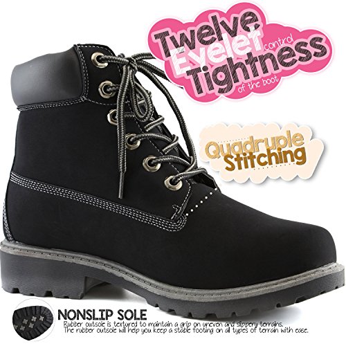-. Feature : CLASSIC DESIGN Military-inspired boot is ankle high round toe and laces up with six eyes for a supportive fit. Approx 1.25" Heel, 6.5" Tall. / PERFECT FOR WORK OR PLAY Reinforced toe provides protection, so you can wear these boots on the job, yet they're stylish enough for after hours. The Women's Lace-Up Ankle Boot is perfect for wearing when you're on the job or doing chores around the house. The toe is reinforced to provide ample protection for your feet, and the six eyelet lace-up front allows the boot to provide maximum support for the ankles. / COMFORT ASSURED These women's boots feature padding along the collar to prevent chafing and have a cushioned foot bed with a padded insole. The boots feature contrast stitching, and the two-tone laces give them a feminine finishing touch. You can choose from classic colors like black and navy or go for feminine pink or smoky grey for a head-turning look. / NONSLIP SOLE Rubber outsole is textured to maintain a grip on uneven and slippery terrains. The rubber outsole will help you keep a stable footing on all types of terrain with ease. / BUT ALSO PERFECT FOR PLAY---Not just for work, the Women's Lace-Up Ankle Boot has a timeless design that is perfect for pairing with casual looks like jeans or for adding an edgy finish to skirts and dresses. The boots feature contrast stitching, and the two-tone laces give them a feminine finishing touch.