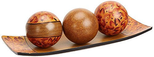- MEASUREMENTS/MATERIAL: Each orb measures 3.94" diameter and is multi colored and the tray is 15.4" x 6.4" x 1.7" is brown in color and both are made of wood.