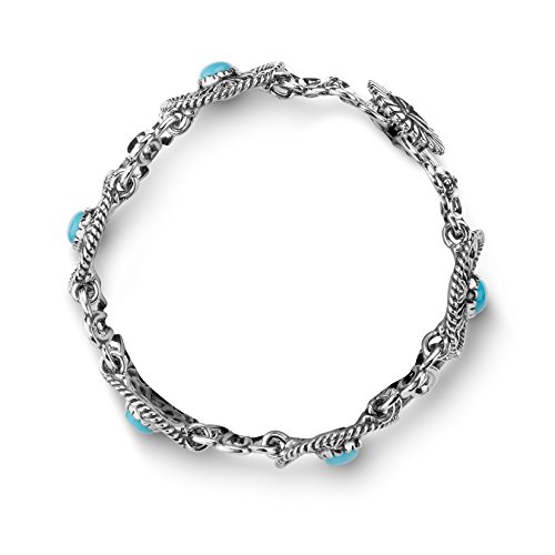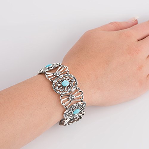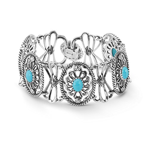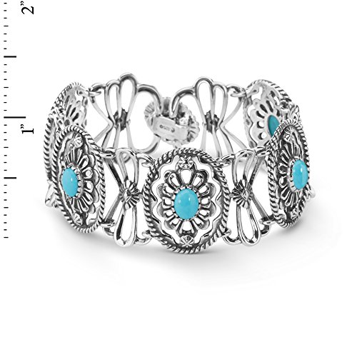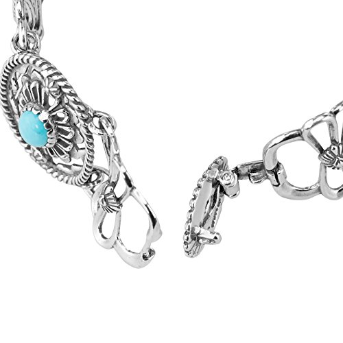 From the American West Classics Collection - Sterling silver openwork concha designs with textured rope detail lay the beautiful backdrop for this intricate and unique bracelet. Oval cabochons of turquoise sit center stage in each of the conchas for a pop of color and fun! Finished with a sterling silver clasp closure.