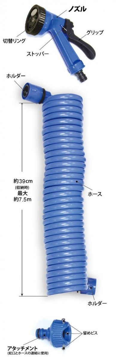 | サイズ | ホース/収納時:約39cm・使用時:最大7.5m 個装サイズ:26×21×11cm |
