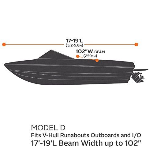 TRAILERABLE BOAT COVER: Fits most boats 17' - 19' L x 102" W with or without windshield (including V-hull runabouts, outboards and I/O, and others), full cut to allow extra room for accessories such as bow rails and running lights