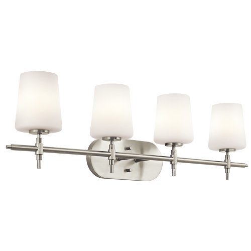 Studio : Kichler Lighting Publisher : Kichler Lighting Product Description 10.5IN high x 35.25IN wide x 6.5IN extension, Requires four 100W medium base incandescent bulbs, Brushed nickel finish with satin etched cased opal glass, Coordinates with the Arvella collection, UL Listed for dry indoor locations 0