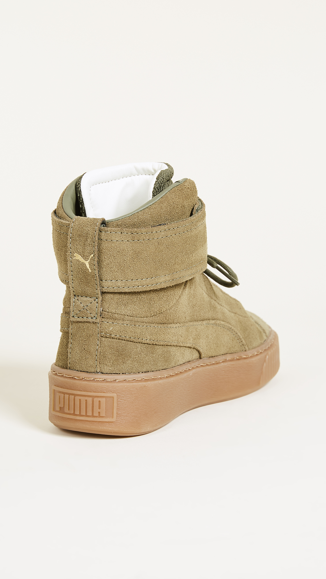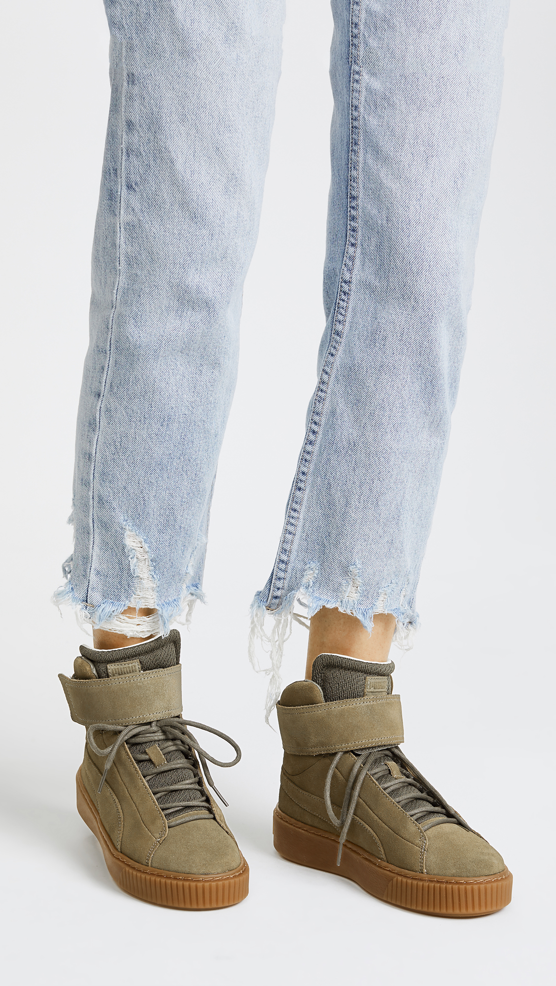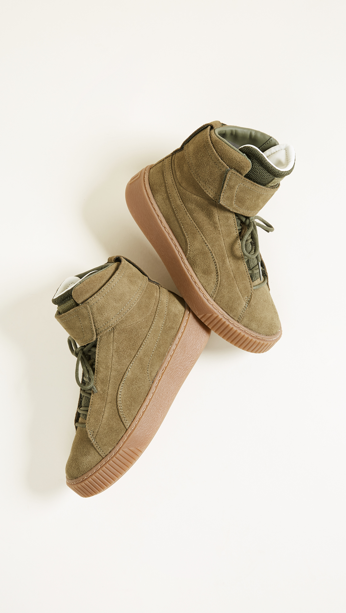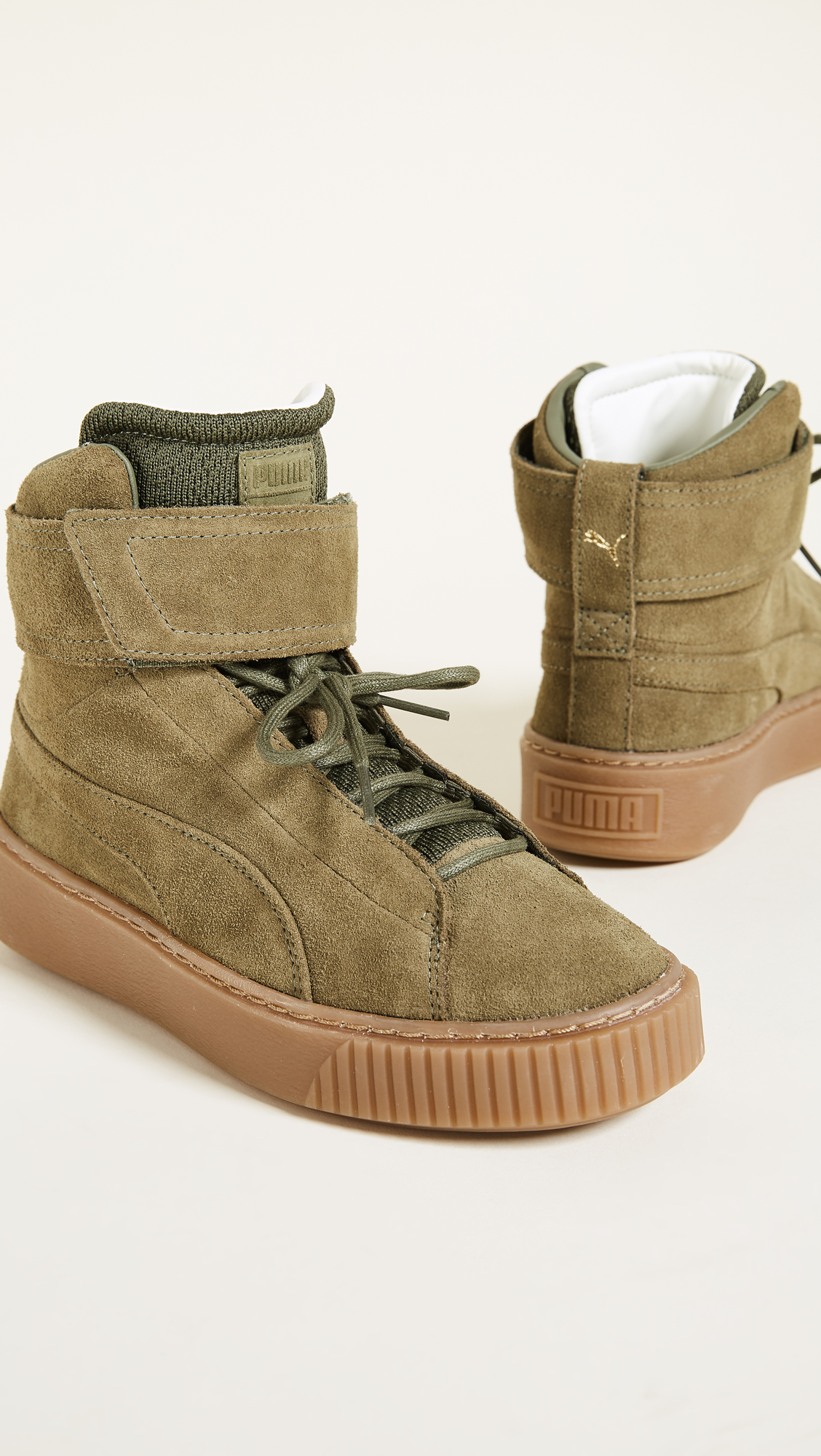 Suede PUMA high-top sneakers featuring a Velcro strap at the padded collar. Inset laces cover the tonal mesh tongue. Textured platform. Rubber sole.
