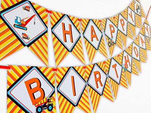 -. Feature : 15 paper pennant flags which spell Happy Birthday as well as 2 end pieces featuring construction vehicles / Approximately 16 feet of coordinating 3/8" ribbon including for stringing the banner panels / Each banner panel is 6"x 8" / ASSEMBLY REQUIRED: We provide the panels collated in order and then you can choose to create a double or single strand and can also determine the spacing of the panels based on what is best for your display area