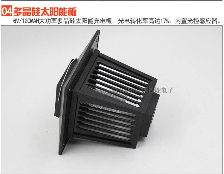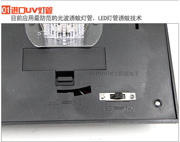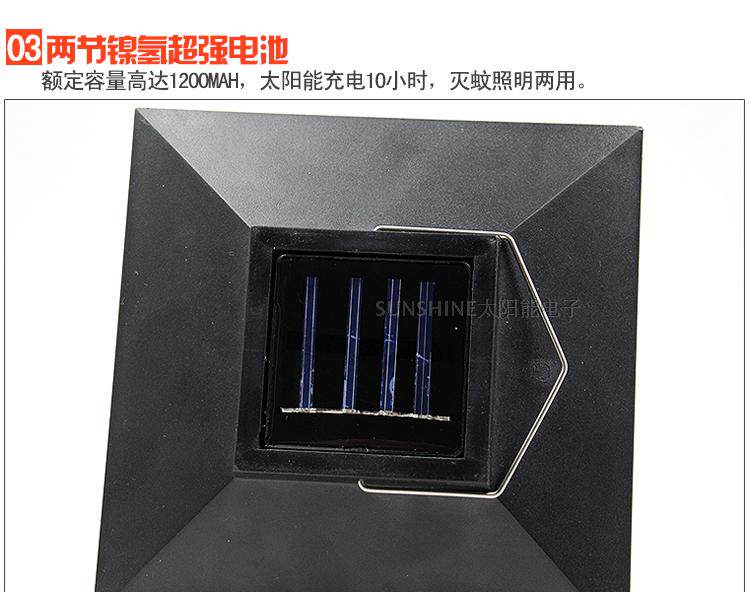 Set the solar energy switch to "ON1" or "ON2" and put the solar panels in a sunny place at 45 to 90 degrees in the sun and 10 to 10 hours in the sun (E> = 20000LX) The battery is full. Even if the switch in the "ON1" for the anti-mosquito function, such as the switch in the "ON2" for the lighting function.