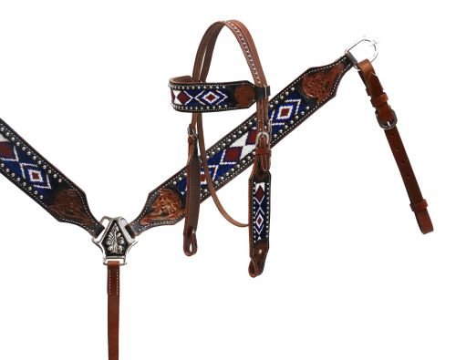 Studio : Shiloh Publisher : Shiloh Binding : Misc. Product Description Showman® beaded inlay headstall and breast collar. This set features black leather with medium leather tooling and a dark purple and maroon beaded inlay design accented with silver studs. Headstall comes with 5/8" x 7' leather split reins. 0