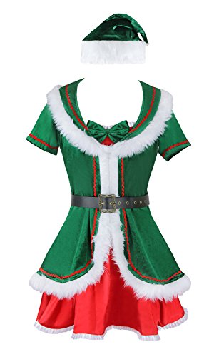 -. Feature : This item is NOT the standard size, please choose it according to our size chart located on the left of the picture or in the product description below, instead of your normally wear size or Amazon size guide / A satin-like red strapless dress with sweetheart neckline and ruffled hemline, a dark green velvet coat dress with short sleeves, garnished with white faux fur, zipper in the back for convenience / Package includes 6 pcs, red satin dress, green velvet outer coat, hat, belt, shoe covers and thong / Perfect for Christmas, Halloween party, festivals, theme party, fashion show and role play / Hand wash separately in cold water, do not use machine