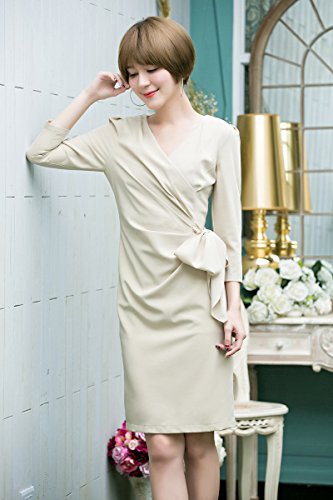 -. Title : Mystin-jp レディース ドレス フォーマル パーティー 上品 Vネック フリル ワンピースチュニック 着痩せ 膝丈 結婚式 パーティー 杏色 S