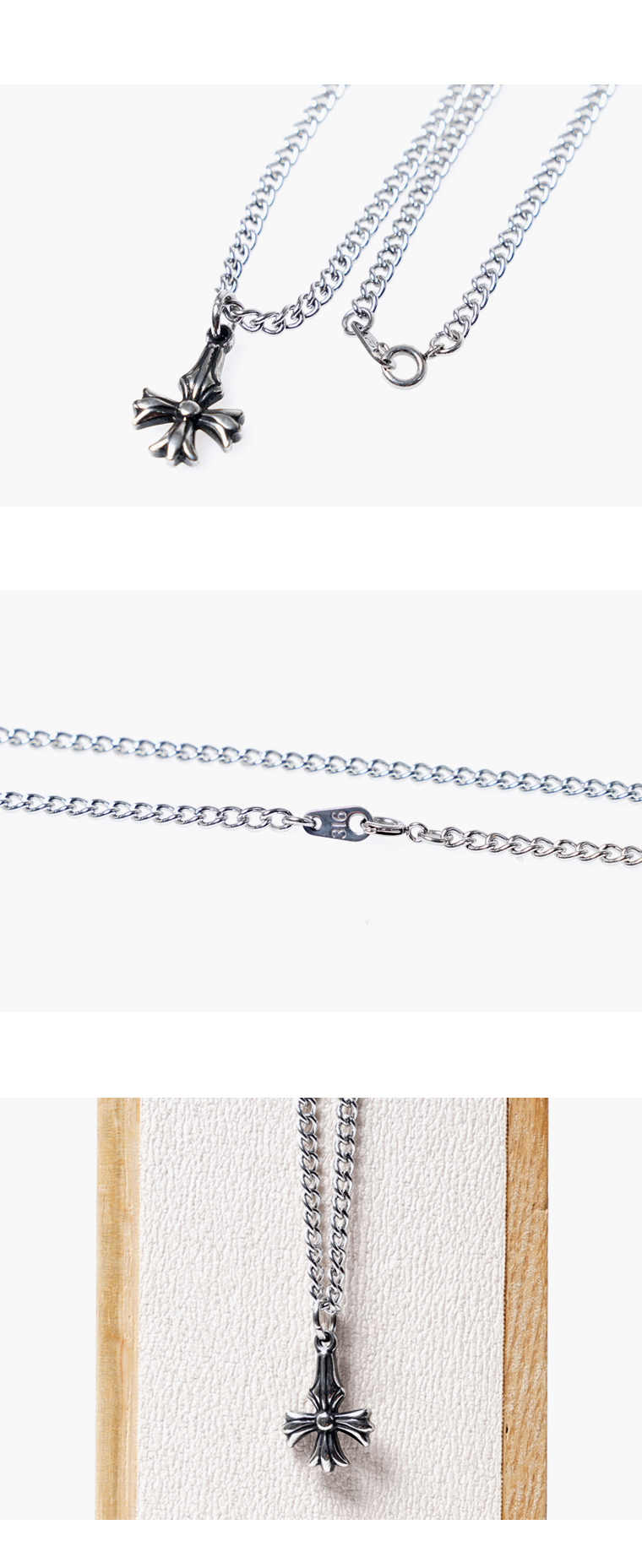 써지컬 스틸로 제작된 남녀공용 목걸이입니다. 무난한 라운딩타입 체인스트링에 앤틱가공된 십자가팬던트를 포인트로 한 목걸이로 가볍게 코디하기에 좋습니다. 체인과 장식 모두 써지컬스틸로 제작되어 오래도록 변색이나 알러지 걱정 없이 착용이 가능합니다. 남성용과 여성용 사이즈로 제작되고 별도사이즈 주문도 가능합니다.