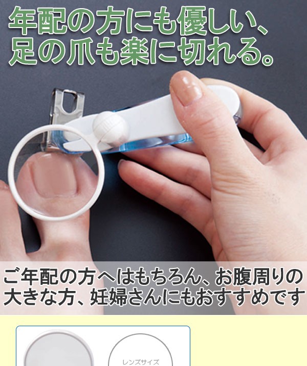| 360度回転刃!刃先の角度が自由に変えられるので、屈みにくい方も楽な姿勢で爪を切る事が出来ます。また拡大ルーペ付きなので視力の落ちた方も爪が切りやすい。ルーペはマグネット式なので不要な時は自由に取り外す事が出来ます。つめきり/ツメキリ/つめ切り/足の爪/敬老の日/妊婦/年配/高齢 |