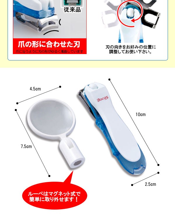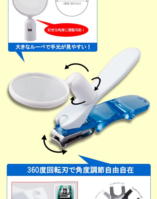 | 360度回転刃!刃先の角度が自由に変えられるので、屈みにくい方も楽な姿勢で爪を切る事が出来ます。また拡大ルーペ付きなので視力の落ちた方も爪が切りやすい。ルーペはマグネット式なので不要な時は自由に取り外す事が出来ます。 |