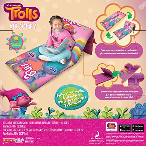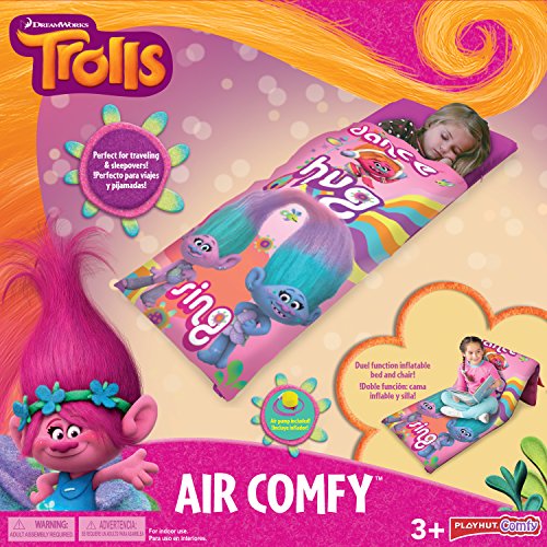 ReleaseDate : 2017-07-18 Studio : Playhut, Inc. Publisher : Playhut, Inc. Binding : Toy Product Description Your little ones will sleep soundly with their favorite characters during bedtime with the Trolls air comfy bed. This inflatable slumber bag provides kids with comfy place to lie for daytime naps or slumber parties at night. Comes with foot air pump to inflate cushion. Made with lightweight material, the Trolls air comfy is great for travel and overnights. 0