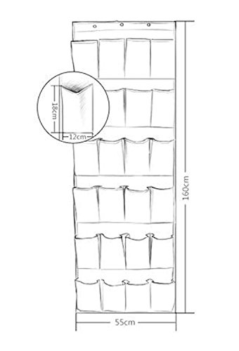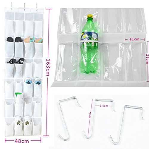 -. Feature : 24-pocket over the door/wall hanging shoes organizer, features heavy duty Non-woven fabric for durable use. Finely reinforced stitched, soft enough for folding, easy clean with a wet cloth. / Total Size: 64.2'' H*18.9''L, Pocket Size 8.2''H*4.3''L. Hassle free assembly, no tools required, quickly hanging it OVER your door with 3 sturdy stainless overdoor hooks included. It can be folded for an easy storage. / Significant spacious shoes organizer provides easy access to all small items. Great for creating additional storage space and storing various small items like shoes, CD, folded umbrella, Battery Chargers, Pens, Sticky notes, Makeup brushes comestic stuffs, Toys, Gadget tools, socks, underwear clothes, etc. / Hold a variety of different items on a door in any room; truly a multi-purpose storage solution to help keep your bedroom tidy and organised / Package includes: 1*24-pocket over the door hanging shoe organizer; 3*stainless hooks for convenient hanging.