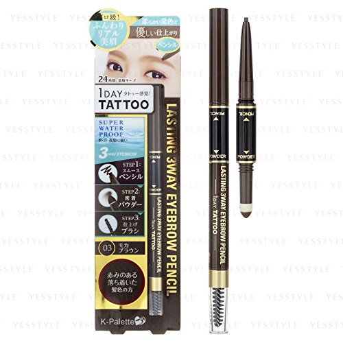 -. Feature : K-Palette - Lasting 3 Way Eyebrow Pencil (#03 Mocha Brown) / Brow pencil in one end, a spoolie brush on the other and brow powder in the middle. / Waterproof, sweatproof, and smudge proof.