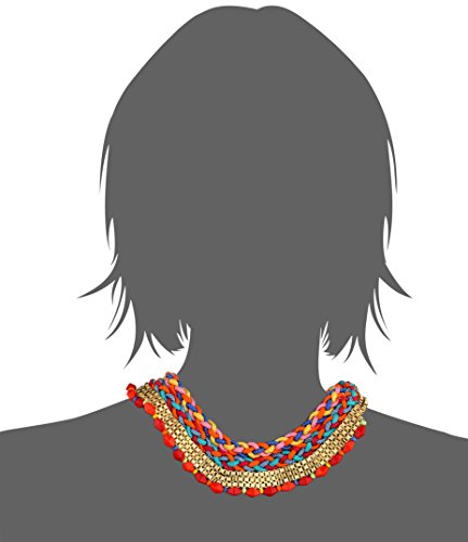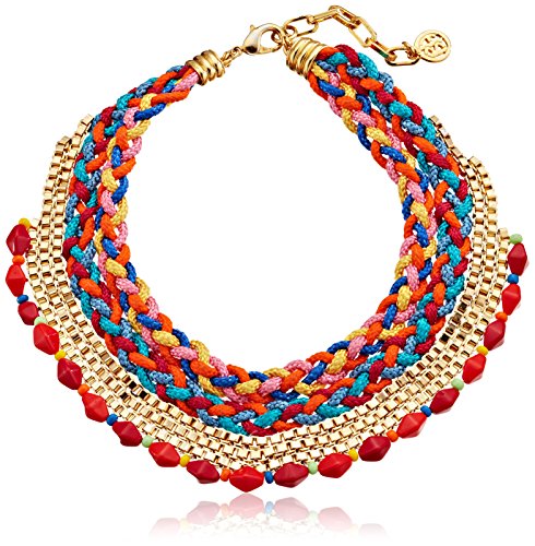 Bib necklace made of gold-tone chain, beaded strand, and braided cord featuring gold-tone lobster-clasp closure