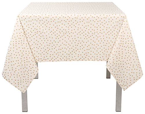 - Metallic gold confetti against a creamy white background makes this tablecloth perfect for holiday entertaining.