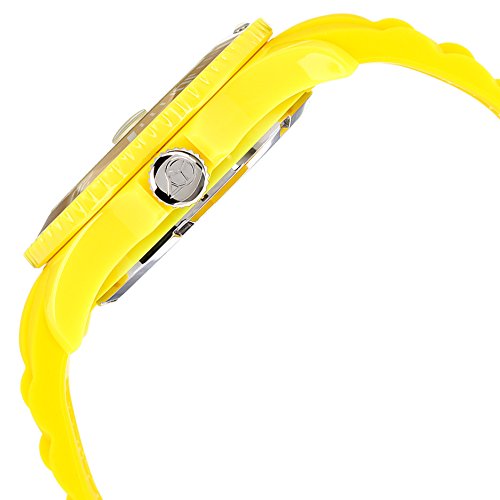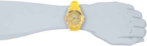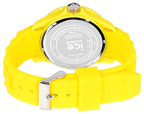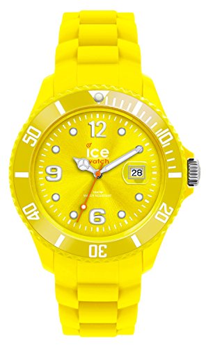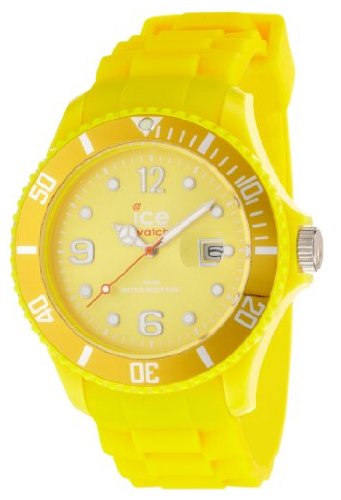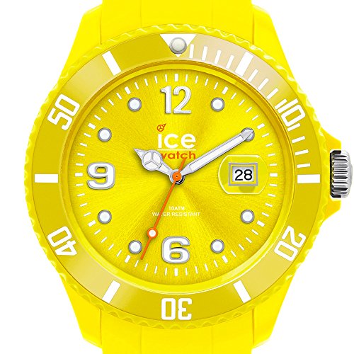 Amazon.com A fun, bright accessory that offers precise timekeeping abilities, the Ice-Watch Men's Sili Collection Yellow Plastic and Silicone Watch features a circular, yellow dial with luminous hands, easy-to-read Arabic numeral hour indexes at three, six, nine, and 12 o'clock, and a date display at the three o'clock position. A yellow-toned stainless steel bezel frames the dial and is engraved with markers from zero to 60. A durable mineral crystal window offers a handy magnifier. Made of strong silicone, the yellow watch strap feels comfortable on for extended periods of time and is secured with a buckle. The Ice-Watch Men's Sili Collection Yellow Plastic and Silicone Watch is equipped with high-quality Miyota Japanese-quartz movement and is water resistant to 165 feet (50 meters). 0
