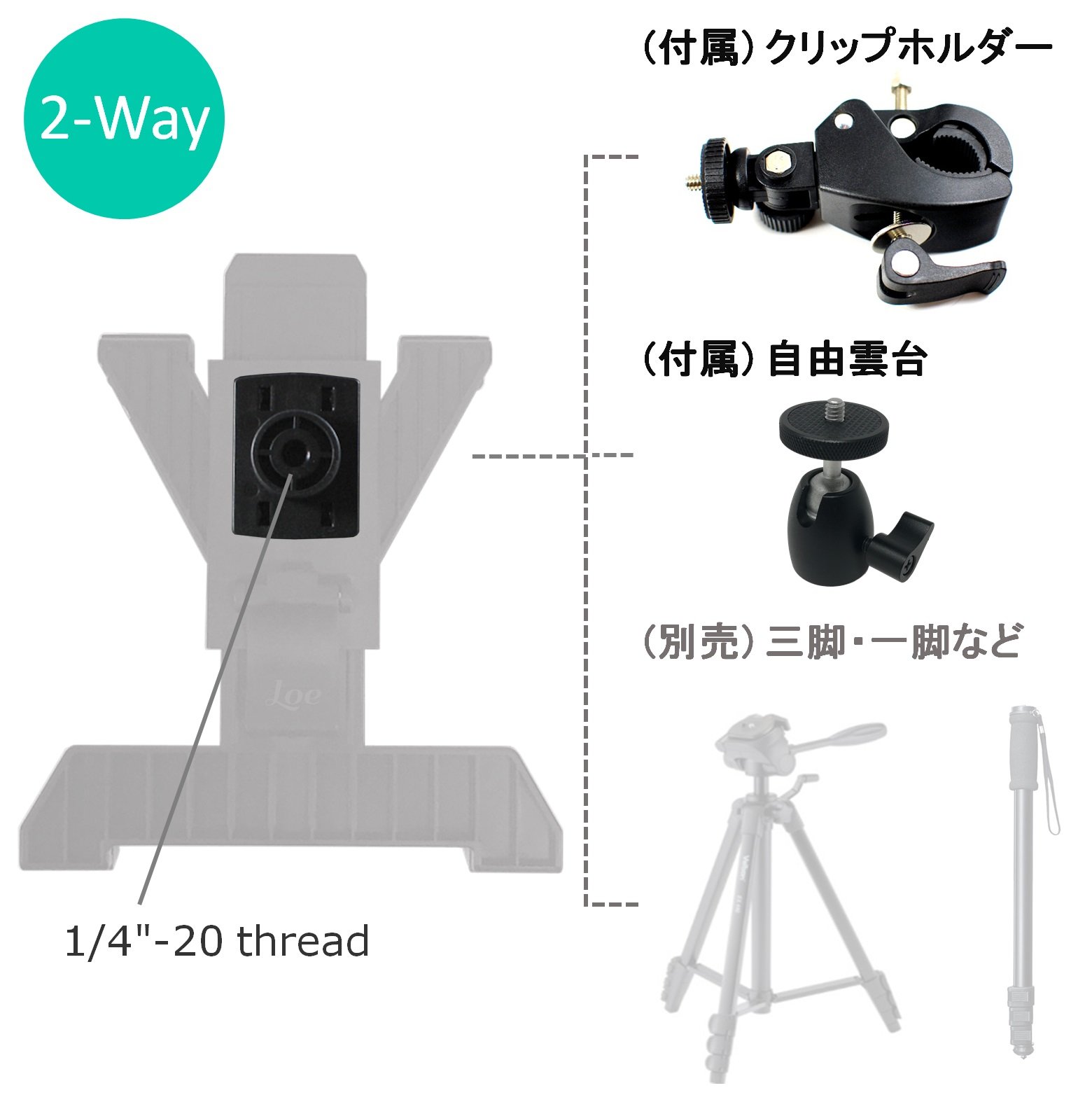 It is possible to attach to the included clip or free head with 1/4 inch screw.