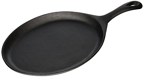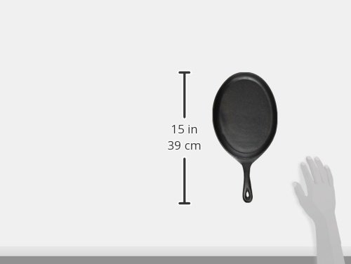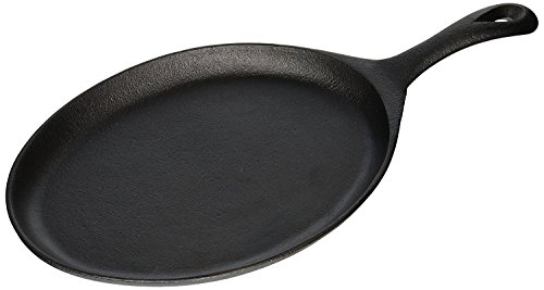 This skillet is made of cast iron material. This cast iron skillet has a handle and is to be used with a wood serving trivet (BG78U) or rattan underliner (573706). Comes with oval shape. Measures 7-inch length by 9-1/2-inch width.