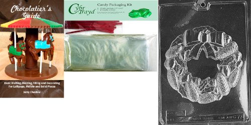 Cybrtrayd Wreath with Hole Chocolate Mold with Chocolatier's Bundle of 25 Cello Bags, 25 Red Twist Ties and Chocolatier's Guide