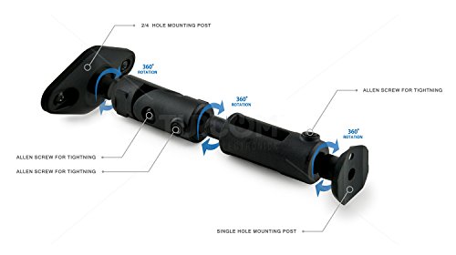 -. Feature : Ideal for mounting home theater satellite speakers on walls or ceilings / Supports speakers weighing 10 pounds or less / Made of durable, weather resistant, injection molded fiber resin reinforced polymer / Multiple tilt and swivel pivot points allow perfect directional speaker aiming / Designed to fit all home theater satellite speakers with one threaded mounting hole, two threaded mounting holes or keyhole mounting systems