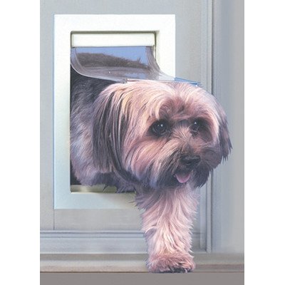 Product Description Now "Fido" can let himself in and out with this terrific Fast Fit Pet Patio Door. It only takes a minute to install this useful patio pet panel with its draft stopping watertight seal, and you can even take it with you when you move. There is no assembly required because it adjusts in height from 78 3/4" to 81 1/4" to ensure a perfect fit in any sliding glass door, either right or left opening. Your pet passes through a 5" x 7" size flap. Made of tough safety glass, it has a lockout slide and a security lock for added protection. Available in Mill (Aluminum), White or Bronze finishes. .