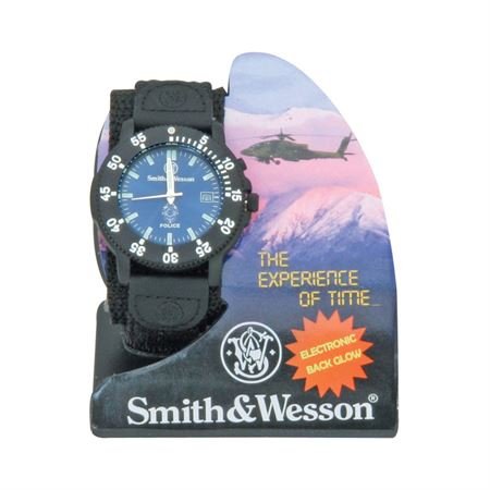 The Smith & Wesson SWW-455P Police Watch is a timepiece designed to keep up with your active lifestyle, while maintaining its bold look and dependability. Crafted with all the precision and reliability that's made Smith & Wesson a staple in the law enforcement community. Equal parts sturdy and stylish, it's all the watch you want, with the attention to detail and performance that you've come to expect from Smith & Wesson. This watch features precision quartz Japanese movement and includes (3) hands to show the hours, minutes and seconds, date display and a scratch resistant hardened mineral glass crystal that protects the dial. The electronic back-glow and glowing hands make for easy reading at night. The case comes in a stainless steel black-finish with a stainless steel caseback and the metal rotating bezel makes it easy to track elapsed time. This timepiece is water resistant up to 30-meters (90-feet) and ideal for anyone looking for adventure, sport or any daily rugged outdoor activity. The Smith & Wesson SWW-455P Police Watch comes with a 1-year limited warranty. CampCo is an established wholesale stocking master distributor. 2015 marks our 25th year of service to retailers all over the world. We are the official worldwide licensee for Smith & Wesson Watches and Pepper Spray, Humvee-gear, and UZI products. Our friendly and courteous staff are ready and willing to answer any of your questions. We pride ourselves in having the latest and most innovative products in the industry.Feature