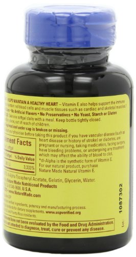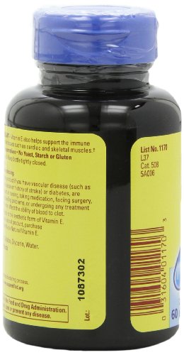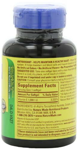 -. Binding : Health and Beauty -. Brand : Nature Made -. Color : multicolored -. EAN : 0031604011703 -. Feature : Pack of three, 60-count per bottle (total of 180 counts) / Recommended as part of daily regimen for heart health, general health, longevity and prenatal care / Protects body's cells from compounds such as lead and mercury / Recommended for use in conjunction with Vitamin C -. IsAdultProduct : 0 -. Label : Nature Made -. Manufacturer : Nature Made -. MPN : 031604011703 -. NumberOfItems : 3 -. PackageQuantity : 3 -. PartNumber : 031604011703 -. ProductGroup : Health and Beauty -. ProductTypeName : HEALTH_PERSONAL_CARE -. Publisher : Nature Made -. Size : 1 -. Studio : Nature Made -. Title : Nature Made Vitamin E 1000IU, 60 Softgels (Pack of 3) -. UPC : 031604011703