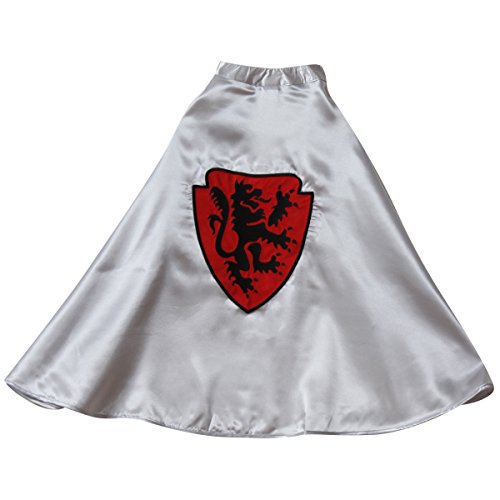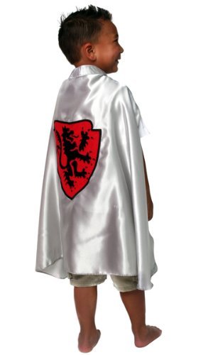 -. Feature : High quality embroidery design / Detailed knight emblem / Velcro neck closure / Silver satin fabric with serged edge / Cape is 24" long for ages 3 up