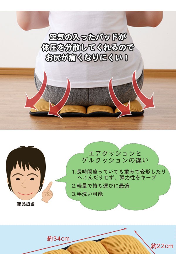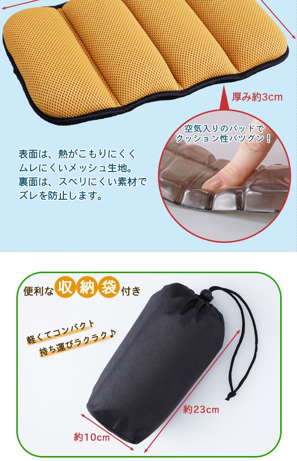 | エアーパッド入りで体圧を分散してくれる携帯クッション。ゲルクッションと違い、長時間座っていてもヘコんだり変形したりせず弾力性をキープし、お尻が痛くなりにくい!収納袋付き、コンパクトに折り畳めて軽量なので持ち運びも便利。レジャー・アウトドア・スポーツ観戦・バス旅行・長時間の乗り物に!汚れたら手洗いOK。表面はメッシュ生地でムレにくく、裏面は滑りにくい素材でズレを防止。 |