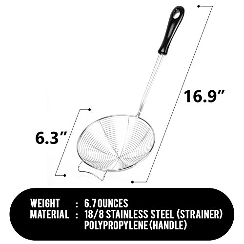 HEAT-RESISTANT HANDLE - The handle of this spider skimmer is made of non-slip PP material. With the length of 16.9", it protects your hands from the heat source and remains cool.