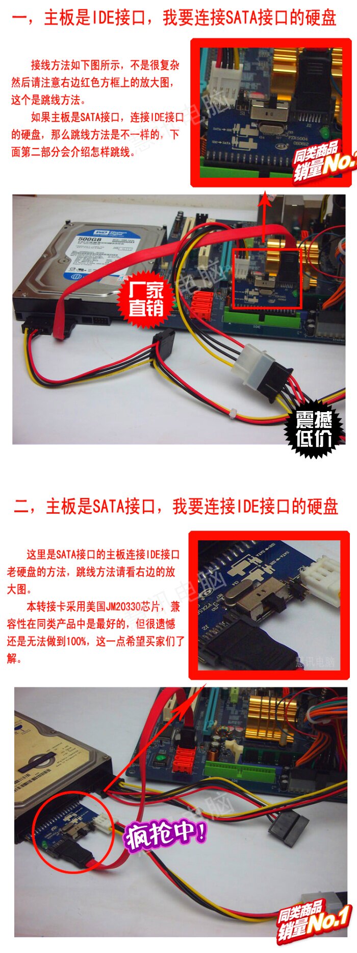 1、此套里的转接卡为双向转接卡,就是可以转IDE为SATA,也可以SATA转为IDE,一卡双转,更方便;