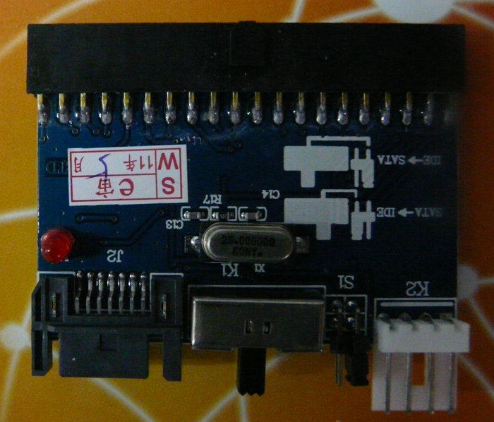 3.将你的IDE设备插入转接卡的IDE座(注意正反,有防反插的凸起,同时你的IDE硬盘需要跳主);