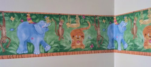 -. Feature : Jungle Themed Wallpaper Border / Monkeys, Elephants, Birds, Tigers / 15 Foot Long Prepasted Wallpaper Border / Pattern YD40225B 9 Inches Wide