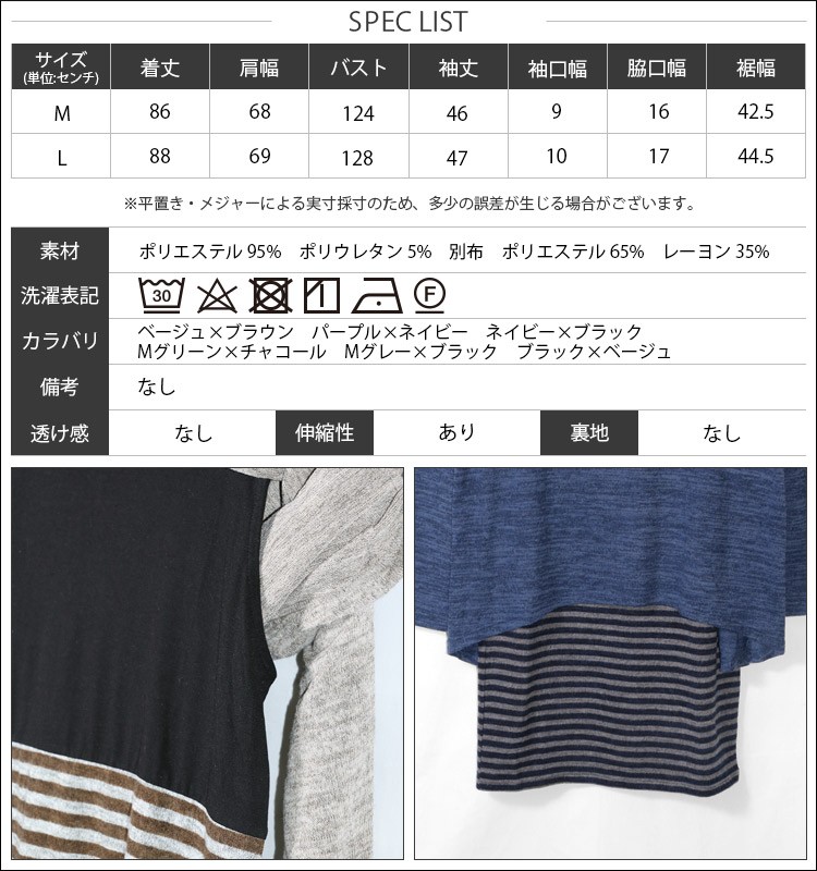 L:着丈 88cm 肩幅 69cm バスト 128cm 袖丈 47cm 袖口幅 10cm 脇口幅 17cm 裾幅 44.5cm