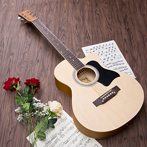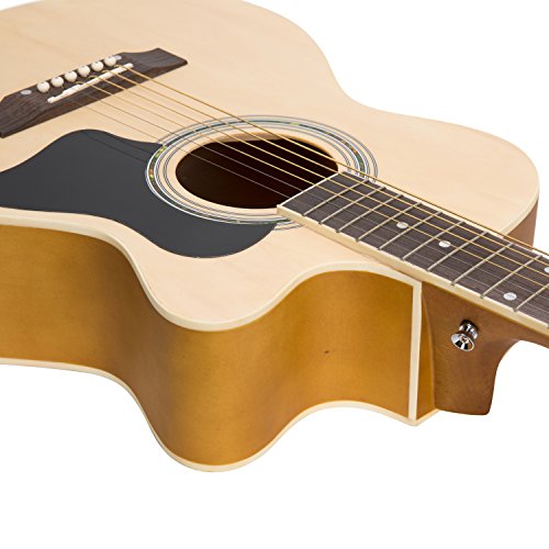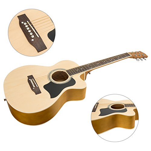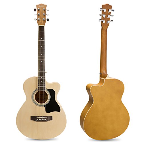 Specifications: Size: 39 in Style: Acoustic Guitar Color: Matte Natural Package Dimensions: 39.56 x 17.91 x 4.33 in Shipping weight: 6.6 pounds Materials: Top: Linden Back Sides: Linden with Black ABS Neck: Maple Fingerboard Bridge: Maple Fret: Brass Hand Orientation: Right Handed