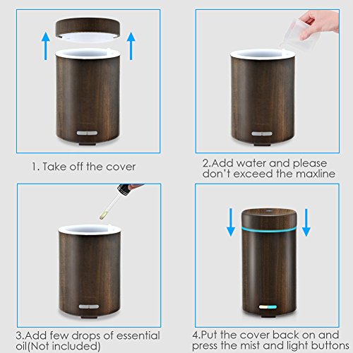 Notes: Please add water below the Max line(less water, more mist) Please clean it at least once a week,keep it dry when you are not using it. Please use only 100% pure and natural essential oils and fresh water to make things better.